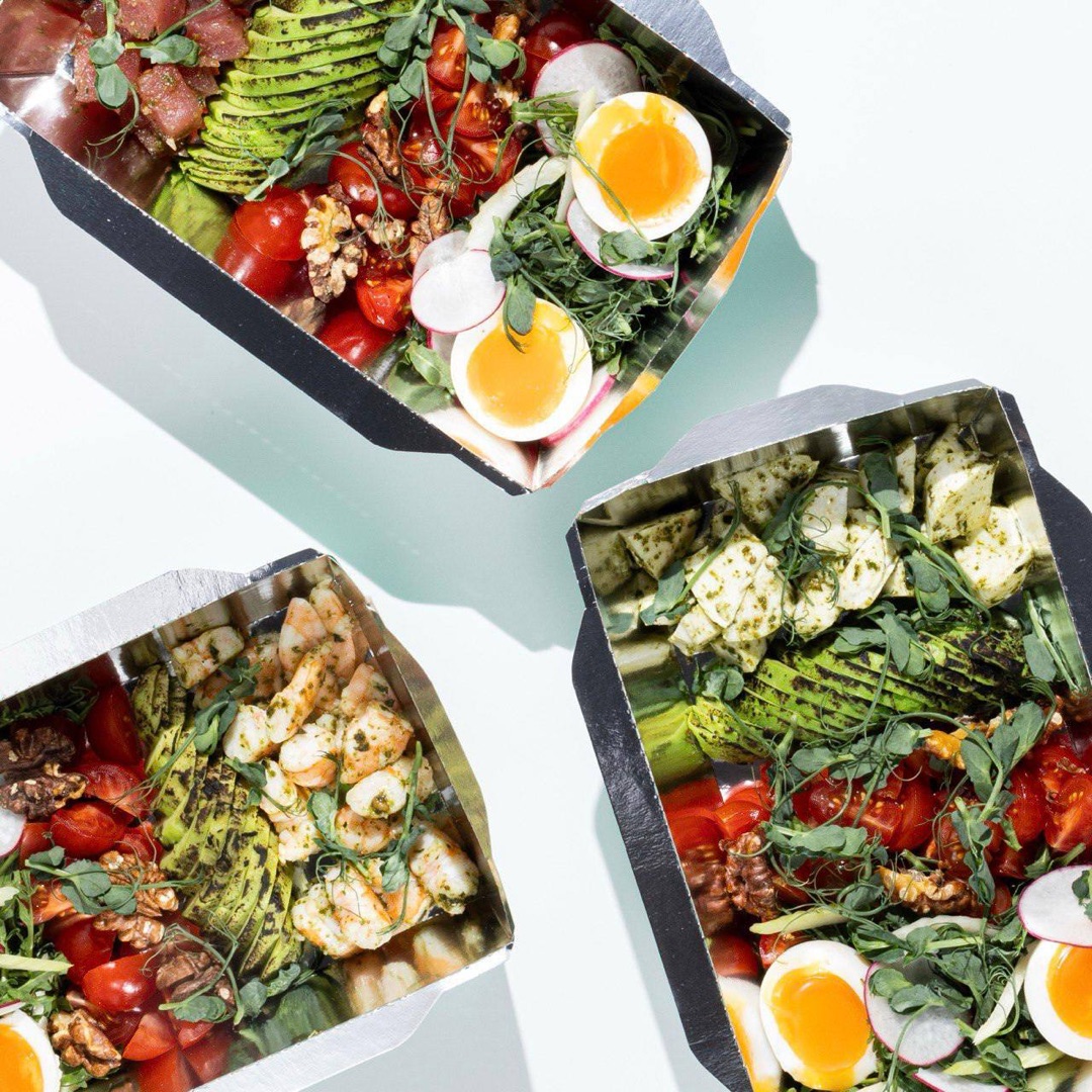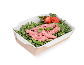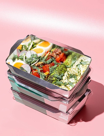Для салатов и горячих блюд были забрендированы контейнеры OSQ OpSalad 500 и OSQ OpSalad 800. Мы снова использовали картон KomiFRESH, флексографическую печать и покрыли контейнеры серебряной ламинацией. Благодаря такому виду ламинации при открытии упаковки создаётся эффект wow-эффект.