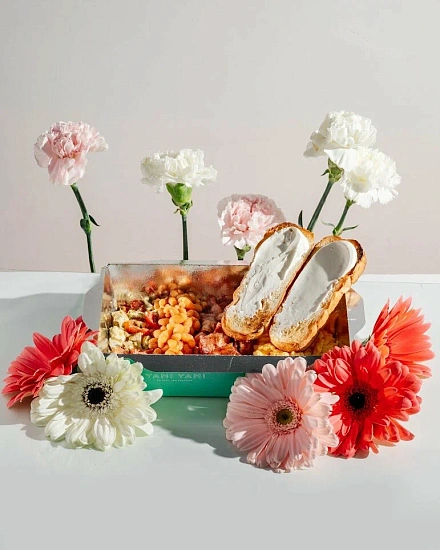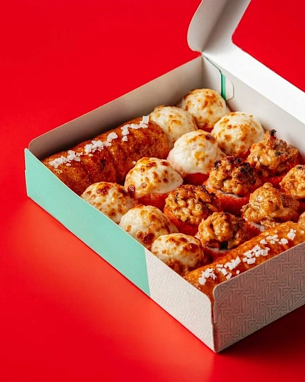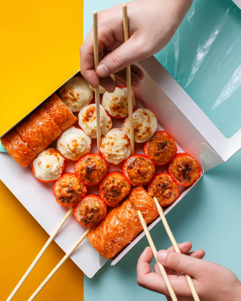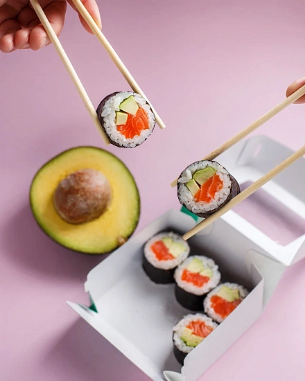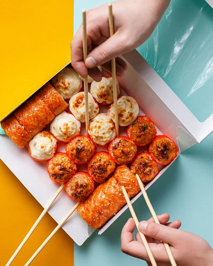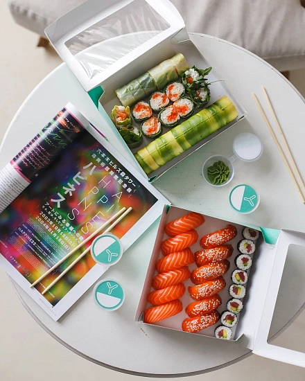 Для основной линейки блюд, куда входят суши и роллы, мы создали три новых размера OSQ Tabox Pro. Для них использовался немелованный картон KomiFRESH плотностью 280 грамм. Мы применили флексографическую печать и покрыли конструкцию жемчужной ламинацией, которая защищает от влаги и жира, придаёт приятную гладкость и лёгкий перламутровый блеск. За счёт этого упаковка становится необычной и визуально более привлекательной, подчёркивая элементы фирменного стиля Yami Yami.