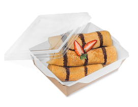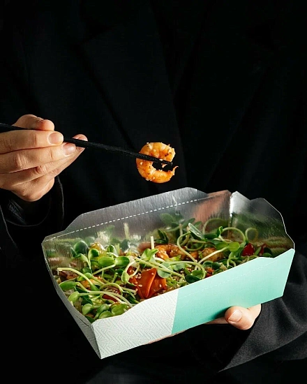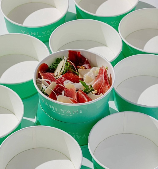 Для холодных закусок мы нанесли на OSQ Round Bowl 1300 индивидуальный дизайн клиента. Данная позиция производится на нашей площадке в Калининграде. Для изготовления OSQ Round Bowl 1300 мы использовали немелованный белый картон KomiBASE LUX плотностью 260 грамм, применили офсетную печать и нанесли водно-дисперсионный лак, чтобы краска хорошо держалась. Для защиты конструкции от прожиривания был нанесён PE-полив. Получилась прочная и яркая упаковка в стилистике бренда.