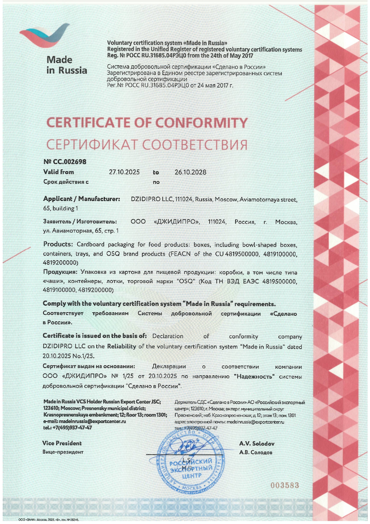 Успешное прохождение сертификации — не просто формальность. Это признание того, что продукция OSQ Group соответствует жёстким стандартам пищевого производства. Наши клиенты могут быть уверены в неизменно высоком качестве нашей упаковки.Сегодня мы не только укрепляем позиции на внутреннем рынке, но и активно расширяем экспортные возможности. Участие в проекте открывает для OSQ Group новые перспективы в этом направлении.